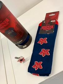 Set composto da una T-shirt taglia L/XL, un paio di calze taglia Unics e un mini Funko Pop della Kinder Joy, tutto a tema Stranger Things.