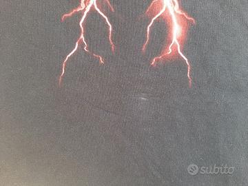 T-shirt nera, 100% cotone, originale. Leggermente sbiadita al collo e con un piccolo segno (dovuto alla molletta usata x stendere ) al centro davanti e dietro. Ampia vestibilità.