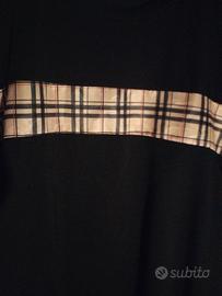 Vendo bellissima t-shirt nera a maniche corte, caratterizzata da un'iconica banda orizzontale con motivo a quadri (check) che riprende uno stile classico ed elegante.