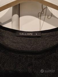 t-shirt nera con pizzo taglia S brand Calliope. Utilizzata più volte, si possono vedere i segni del tempo. Per il resto è in buono stato. La maglietta è composta da viscosa, poliestere e poliammide.