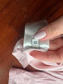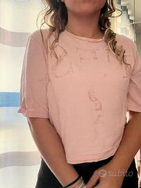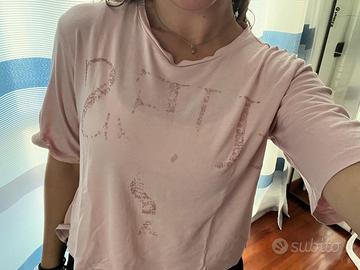 T-SHIRT ORIGINALE GUESS ROSA CHIARO CON STAMPA LOGO GLITTER DISTRESSED Capo originale Guess, sinonimo di stile contemporaneo e glamour! Questa T-shirt unisce la comodità del cotone casual all'eleganza pop-chic del brand. Il suo elemento distintivo è la stampa logata effetto "distressed" (invecchiato) con finitura glitter, un dettaglio di design molto ricercato e assolutamente voluto dalla casa di moda. È l'acquisto perfetto per aggiungere carattere e lusso discreto al tuo abbigliamento di tutti i giorni. Vendo questa favolosa T-shirt da donna, un articolo autentico Guess di alta qualità. È un capo incredibilmente versatile, ideale per vestire con leggerezza le stagioni calde come l'estate e la primavera, o come base stilosa sotto giacche e cardigan durante le mezze stagioni. ✅ Dettagli del Brand e Colore: Brand: Guess (un nome che garantisce moda attuale e materiali di qualità). Colore: La tonalità è un delicato e luminoso rosa chiaro, che può apparire come un salmone tenue o un rosa nude a seconda della luce. È una scelta cromatica estremamente femminile, luminosa e facile da abbinare a capi scuri (come il nero visibile in foto) o chiari, creando sempre un look fresco e curato. Tessuto: La consistenza visibile suggerisce un morbido cotone o un blend di cotone di alta qualità, leggero, traspirante e piacevole al tatto, indispensabile per il comfort quotidiano. ✅ Vestibilità e Stile: La maglietta presenta una vestibilità rilassata e confortevole, che non stringe e offre una grande libertà di movimento, adattandosi armoniosamente a diverse silhouette. Lo scollo è un moderno e ampio girocollo (wide crew neck), che regala un tocco di eleganza casual. ✅ Il Dettaglio Esclusivo: Stampa Logata Glitter Distressed Il focus del design è l'ampia stampa grafica sul petto (molto probabilmente il logo Guess o un suo richiamo iconico) realizzata con una speciale finitura glitterata/metallica tono su tono, che cattura la luce con discrezione. PUNTO FONDAMENTALE: L'effetto "c