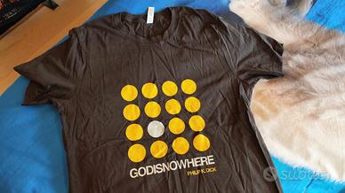 Vendo bellissima t-shirt ispirata al mondo dello scrittore Philip K. Dick, con l'iconica grafica "GODISNOWHERE". Un capo perfetto per amanti della fantascienza e del design minimalista. Unisex (Taglio maschile classico, ottima anche come vestibilità boyfriend/oversize per donna).