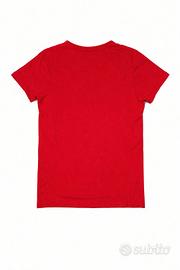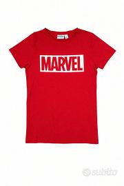 T-shirt rossa a maniche corte con logo Marvel stampato sul petto.