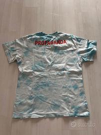 Distinguiti con questa t-shirt Propaganda dal design audace e unico. La maglietta presenta una vivace fantasia tie-dye nei toni del blu e bianco, unita al simbolo iconico rosso del brand sul fronte e alla scritta "PROPAGANDA" sul retro.