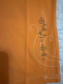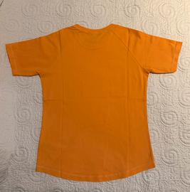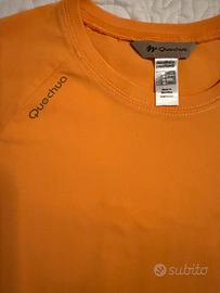 T-shirt Quechua in cotone di colore arancione. - Logo Quechua sul lato frontale tra il collo e la spalla. - Dettaglio decorativo laterale, sul fondo. - Maniche corte. - Girocollo. - Sfiancata con fondo stondato. - Taglia: 14 anni/164 cm. - Indossata pochissimo, come nuova.