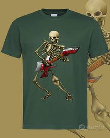 t-shirt personalizzata realizzata dall artista Personelugubri. 100% cotone, stampa raffigurante uno scheletro che suona la chitarra; la stampa è sul fronte della maglia.