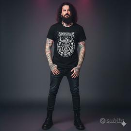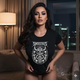 T-shirt nera con un design grafico unico sul davanti, sia per uomo che per donna.