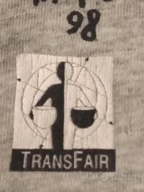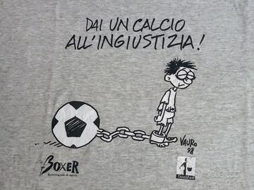 Maglietta t-shirt in puro cotone, con originale stampa sul davanti, Dai un calcio all’ingiustizia, e disegno di Vauro, anno 1998.