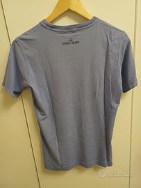 Maglietta originale Stone Island di colore blu (collezione Junior). Presenta una grande stampa frontale con il logo della bussola. Indossata pochissimo e in condizioni pari al nuovo.