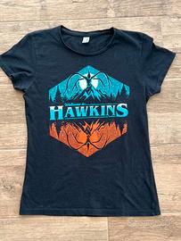 T-shirt blu notte/nera tratta dalla serie Netflix, Stranger Things, firmata Pampling, modello sfiancato da donna, taglia M.