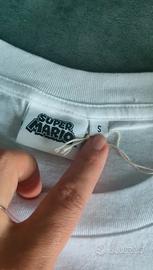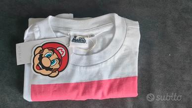 T-shirt da donna con stampa Super Mario. - Stampa di Peach e Mario. - Design con scritta Super Mario glitterato. - Nuova con etichetta.