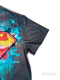 T-shirt uomo taglia M con grafica effetto vernice del logo di Superman. Design moderno e colorato con sfumature blu, rosse e nere. Tessuto leggero e comodo, ideale per l’estate o look streetwear.