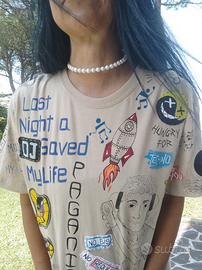Questa t-shirt in cotone color beige, ha un grandissimo lavoro dietro le quinte: la maggior parte dei disegni, rigorosamente fatti a mano, rimandano all'artista, deejay, produttore e musicista della techno, Sam Paganini.