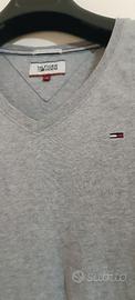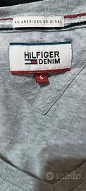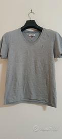 Maglietta a maniche corte con scollo a V. Logo Tommy Hilfiger ricamato sul petto Tessuto morbido e confortevole Taglia S Colore grigio. Condizioni come nuova.