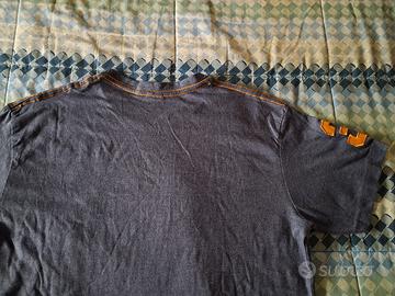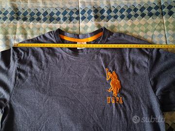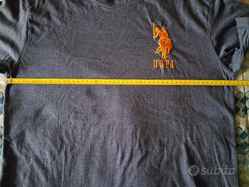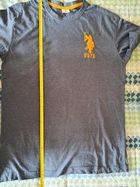 t shirt a mezze maniche, marca U.S. Polo Assn, colore blu mélange con logo e numero dorato, taglia L, misure spalle cm 45, ascelle 51, lunghezza 71.