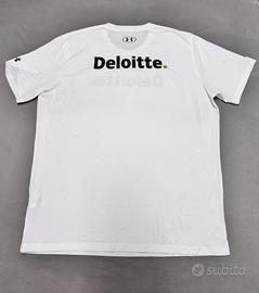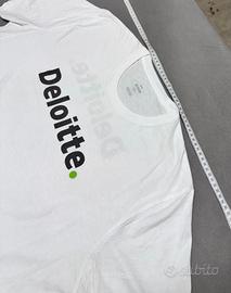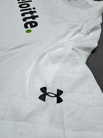Vendo t-shirt tecnica a maniche corte firmata Under Armour in collaborazione con Deloitte. Colore: Bianco con logo Deloitte (nero/punto verde) frontale e posteriore. • Brand: Under Armour (logo sulla manica e all'interno del colletto). • Taglia: XL (Taglio "Loose" / Vestibilità comoda). • Condizioni: Ottime, tessuto ben tenuto, stampe integre senza crepe. • Produzione: Made in Malaysia. Misure precise (come da foto): • Lunghezza totale: circa 80 cm. • Larghezza (ascella-ascella): circa 60 cm.