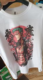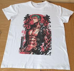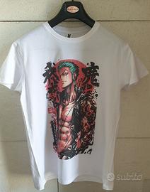 Maglietta bianca 100% COTONE con stampa di Roronoa Zoro da One Piece. La stampa è di alta qualità e i colori sono vividi. - Perfetta per fan di One Piece.