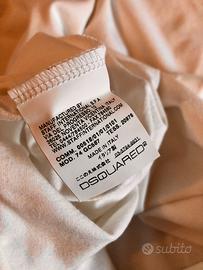 T- shirt uomo Dsquared2 tagli M ( veste stretta), maniche corte, color bianco e bordi del girocollo e delle maniche Rossi, scritta con logo sul petto colore Blue scuro, 100% cotone.