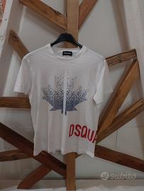 Maglietta a maniche corte, bianca, con foglia a pallini blu e scritta DISQUARED2 in rosso.