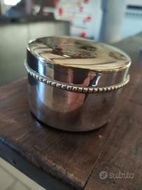 Splendido esemplare di piccola scatola metallica argentata d'epoca, utilizzabile come tabacchiera da fiuto o raffinato porta pastiglie da borsa. L'oggetto si distingue per la sua patina autentica e l'elegante lavorazione. Metallo argentato di alta qualità. Ottimo stato vintage. Con grazioso stemma araldico sul coperchio. Sulla base esterna stemma di corona con lettere AL.