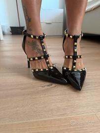 Décolleté nere in vernice con dettagli borchie dorate, stile Valentino. Slancia molto a figura perfetto sia per look eleganti che grintosi. Numero : 36 Stato : Ottime, indossate solo 1 volta. Brand : Prima Donna 👠 Comode e stabili nonostante il tacco, interni morbidi e calzatura perfetta. 📦 Spedizione veloce e imballo accurato. ℹ️ Per altre info non eisitare a contattarmi