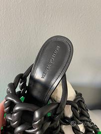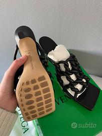 Sandali con comodo tacco nero firmati Bottega Veneta originali taglia 41, completi di scatola, dustbag e tacchetti di ricambio in vera pelle. Consegna a mano su Roma zona piazza della Repubblica o Testaccio.