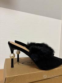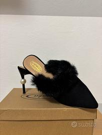 Tacco a spillo aperto sul retro nero con pelliccia e dettaglio sul tacco Marca: Mulanka