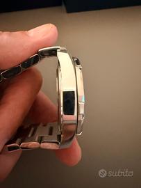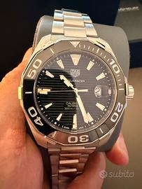 Vendo splendido e robusto Tag Heuer Aquaracer 300m, automatico calibro 5, referenza WAY201A.BA0927, diametro 43 mm. Lunetta girevole unidirezionale in ceramica, impermeabilità 300 m. Datario a ore 3. Un classico sportivo perfetto anche p er l’uso quotidiano. L’orologio è in perfette condizioni generali e viene venduto nella sua confezione originale senza documenti ma con dichiarazione di lecita provenienza. Astenersi affaristi, offro e pretendo massima serietà.