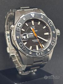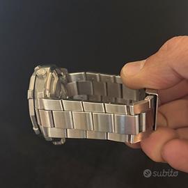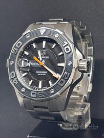 TAG Heuer Aquaracer referenza WAJ1110, orologio subacqueo professionale progettato per elevate prestazioni e utilizzo quotidiano. La cassa in acciaio inox misura 43 mm ed è abbinata a lunetta girevole unidirezionale con scala immersione, elemento distintivo della linea Aquaracer. Il quadrante nero presenta finitura guilloché verticale con indici applicati e sfere luminescenti, garantendo eccellente leggibilità anche in condizioni di scarsa illuminazione. Datario posizionato a ore 9. Il movimento è al quarzo svizzero, preciso e affidabile, ideale per un utilizzo senza pensieri. Vetro zaffiro antigraffio. La resistenza all’acqua è fino a 500 metri, caratteristica che colloca questo modello tra i diver professionali della maison, dotato inoltre di valvola automatica per la fuoriuscita dell’elio, pensata per immersioni in saturazione. Bracciale originale in acciaio con chiusura deployante a doppia sicurezza e prolunga sub. Orologio completo di corredo originale, scatola e controscatola, portadocumenti, istruzioni, card garanzia e tag. La scatola ha gli interni rovinati dl tempo. L’orologio si presenta in buone condizioni generali, cassa con normali segni d’uso coerenti con l’età, non lucidata. Bracciale in buone condizioni e ottimamente serrato. Perfettamente funzionante. Dati tecnici principali: Modello: Aquaracer 500M Referenza: WAJ1110 (WAJ1110.BA0870) Movimento: quarzo svizzero Cassa: acciaio inox Diametro: 43 mm Vetro: zaffiro antigraffio Impermeabilità: 500 metri Ghiera: girevole unidirezionale Funzioni: ore, minuti, secondi, data Larghezza ansa: 20 mm Le foto ad alta definizione sono parte integrante della descrizione. Non saranno accettati reclami per difetti visibili in foto. Trattandosi di orologi antichi non viene garantita la resistenza all'acqua e la precisione. Per ulteriori foto o informazioni non esitate a contattarmi.