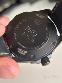 Edizione dallo stile deciso e sportivo, con quadrante camouflage grigio effetto marmorizzato e dettagli gialli.