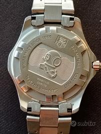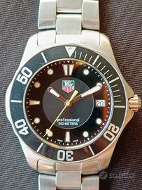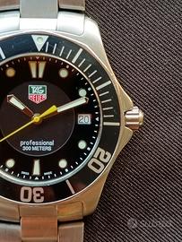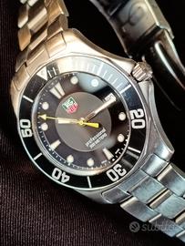 Propongo modello di Aquaracer tra i più ricercati per il suo stile molto riconoscibile e riuscito. Inserto ghiera nero lancetta gialla per un look molto riconoscibile. WR. 300 MT. Ref. WAB1110 - metà anni 2000. Cassa in acciaio da 39 mm escluso corona. Ghiera girevole unidirezionale da 120 scatti con inserto in alluminio nero. Corona originale a vite con logo. Quadrante nero con indici a pallini e lancette stile spada. Trattamento con superluminova Datario a ore 3 con quickset. Movimento al quarzo originale. Vetro zaffiro. Bracciale per polsi fino a 18 cm. SI VENDE IL SOLO OROLOGIO. L'orologio funziona correttamente e tiene bene il tempo anche se non si conosce la data dell'ultima revisione. Le foto sono parte integrante della descrizione, non si accettano resi. Segui il mio profilo ho sempre un assortimento di Longines, Omega, Tag Heuer, Tudor Zenith e altri orologi vintage tank e diver vintage e contemporanei