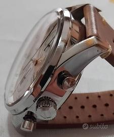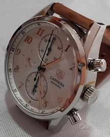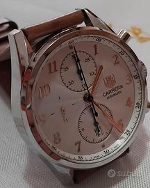 L'orologio mostrato nell'immagine è un TAG Heuer Carrera Heritage Calibre 16, un cronografo automatico che riprende il design iconico ispirato alla leggendaria corsa automobilistica Carrera Panamericana degli anni '60. Specifiche e Caratteristiche Questo modello specifico, identificato dal numero di referenza CAS2112.FC6291, si distingue per i seguenti dettagli: Design del Quadrante: Quadrante argentato con effetto "flinqué" (motivo a onde incise) e numeri arabi applicati color oro rosa. Funzioni: Include un cronografo, piccoli secondi e l'indicazione della data posizionata alle ore 6. Cassa: Realizzata in acciaio inossidabile con un diametro di 41 mm. Movimento: Alimentato dal Calibro 16 di TAG Heuer, un movimento a carica automatica. Cinturino in pelle NON ORIGINALE No scatola No garanzia Vendita tra privati con scambio a mano, ma prendo in considerazione spedizione raccomandata ovviamente a carico dell'acquirente dopo pagamento ricevuto. Valuto parziali permute con orologi di mio gradimento. NO TUTTO SUBITO