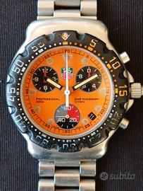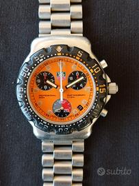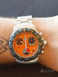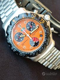 Propongo Tag Heuer formula 1 in una rarissima variante con quadrante arancio, il colore più ricercato per questo modello che ha fatto la storia della casa Svizzera. Full Set e ottimo stato di conservazione per un orologio da collezione. Ref. CA1214 Cassa in acciaio da 38 mm escluso corona. Ghiera girevole unidirezionale in policarbonato nera con numeri bianchi e arancio. Corona a vite originale con logo. Quadrante arancio con lancette a bastone e indici a pallini. Contatori crono dei secondi a ore 6, decimi di secondo crono a ore 3 e delle ore crono a ore 10. Doppia lancetta centrale che misura secondi e minuti crono. Movimento al quarzo Eta 251.262. Vetro zaffiro in perfette condizioni. Bracciale per polsi fino a 17,5 cm. SI VENDE OROLOGIO CON SCATOLA, CONTRO SCATOLA E DOCUMENTI. L'orologio funziona correttamente e tiene bene il tempo anche se non si conosce la data dell'ultima revisione. Le foto sono parte integrante della descrizione, non si accettano resi. Segui il mio profilo ho sempre un assortimento di Longines Omega Tag Heuer Zenith Tank Diver e altri orologi vintage e contemporanei