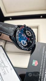 TAG Heuer Grand Carrera Calibre 17 RS2, numero di modello CAV518B. Questo è un cronografo di lusso caratterizzato da una cassa in titanio rivestita in carburo di titanio nero e dal sistema rotante (RS) per i contatori. Dettagli principali dalle tue immagini: Modello: Grand Carrera Calibre 17 RS2 (Ref: CAV518B). Materiale: Cassa rivestita in carburo di titanio (TiC) nero, cinturino in pelle di alligatore nero e chiusura deployante. Condizioni: completo di scatola originale, controscatola, carta di garanzia e certificato COSC (Contrôle Officiel Suisse des Chronomètres).si accettano permute da valutare.