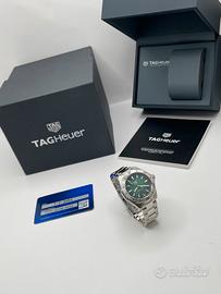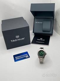 Orologio TAG Heuer Aquaracer Professional 200 con quadrante verde soleil, cassa in acciaio da 40 mm e lunetta girevole unidirezionale. Movimento automatico calibro5 con datario a ore 6, vetro zaffiro antigraffio e impermeabilità fino a 200 metri. Bracciale originale in acciaio con chiusura déployante. Referenza: WBP2115.BA0627 Condizioni eccellenti, completo di scatola e garanzia