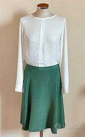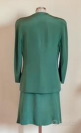 Il tailleur presenta una raffinata tonalità di verde scuro, che può essere descritta come verde foresta o verde muschio, una sfumatura neutra e sofisticata.