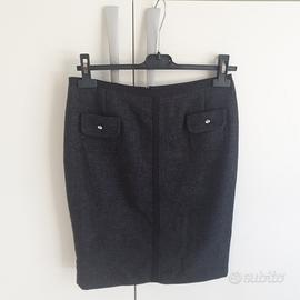 tailleur giacca e gonna, modello chanel, tutto foderato, finiture in Gros grain nero, giacca allacciata con bottoni gioiello,colore antracite, taglia 38 francese, 40/42 italiana.