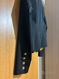 Completo elegante da donna composto da giacca e pantalone, colore nero con bottoni dorati. Taglia M (42 italiana). Vestibilità molto bella, adatto sia per lavoro che occasioni eleganti. In ottime condizioni. Usato una volta . Costava un bel po’
