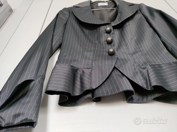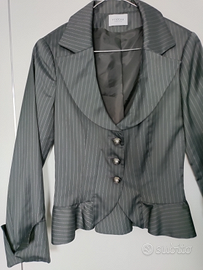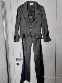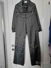 Bellissimo tailleur completo di giacca e pantalone colore grigio raso a righine sottili.
