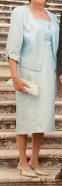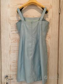 Il colore è un raffinato azzurro molto delicato, con punti luce come da foto, elegante e sofisticato, perfetto per eventi formali, matrimoni o occasioni speciali. Il completo comprende giacca e abito, realizzati con materiali di alta qualità, con cuciture curate e finiture impeccabili tipiche del marchio.