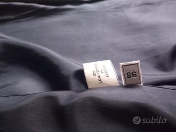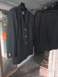 vendo tailleur donna medio peso in lana giacca 3 bottoni gonna con spacchetto in fondo fondo blu con righettina Bianca che disegna quadretto usato pochissimo taglia 52/54