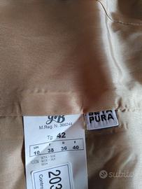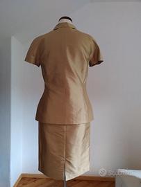 Tailleur Diana Gallesi in Shantung di seta color oro. Giacca a maniche corte, gonna al ginocchio, Interno completamente foderato. La giacca ha due piccole asole in vita per un eventuale cinturino. Taglia 42 leggermente scarsa. Misure gonna: vita 35 cm, fianchi 47 cm, lunghezza 60 cm. Misure giacca: spalle 40 cm, da ascella a ascella 45 cm, giro manica 14 cm, vita 41 (misura piu' stretta) lunghezza 63 cm. Capo pari al nuovo, usato una manciata di ore per una cerimonia.