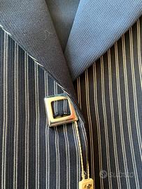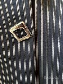 •Giacca a righe verticali blu e bianche, con collo e profili tasche a contrasto e chiusura con bottoni decorativi