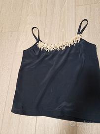 Tailleur in seta blu notte composto da giacca a manica corta con volant, gonna dritta e top con frangia di perle, indossato pochissimo