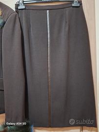 Bellissimo completo donna color marrone bruciato, con pelliccetta colorata sui polsini ( che si possono anche togliere con dei bottoncini) e sul davanti....cerniera, gonna longuette, con striscia centrale in ecopelle, cerniera e bottoncino alla chiusura sul dietro...vendo per inutilizzo...come nuovo usato pochissimo