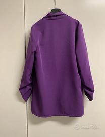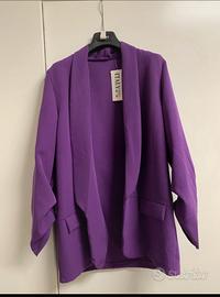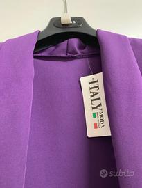 Elegante tailleur da donna composto da giaccaq e pantalone coordinato in una raffinata tonalità viola intenso. La giacca ha una linea pulita e moderna, con maniche 3/4 e vestibilità fluida. Il pantalone presenta vita alta e gamba ampia, per un look sofisticato e confortevole allo stesso tempo.