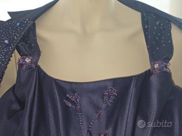 Tailleur donna composto da tre pezzi, gonna top e giacca con ricami in cristallo e gonna particolare sul retro con un nodo finale colore blu violaceo.