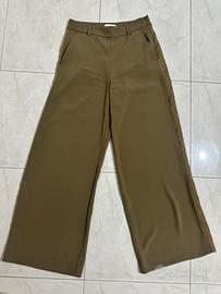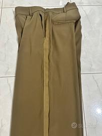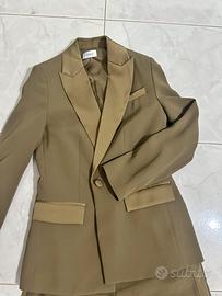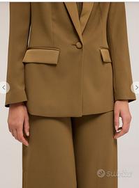 Giacca e pantaloni coordinati in fluido envers satin verde militare. Blazer con dettagli in raso, chiusura monopetto a bottone foderato, finte tasche a patta davanti, fodera interna. Pantaloni palazzo con banda laterale in raso lucido, tasche inserite nei fianchi, chiusura con zip Giacca taglia 36 pantaloni taglia 40 Ottima vestibilità