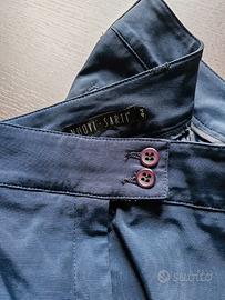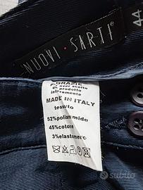 Tailleur blu, effetto lucido. Usato pochissime volte, condizioni ottime. Due pezzi, giacca e pantalone. Linea di facile abbinamento, vestibilità regolare. Dettaglio bottoncini su manica, orlo alto del pantalone.