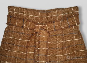 Pantalone a gamba larga e a vita alta arricchita da una cintura a nastro dello stesso tessuto, che può essere annodata in un fiocco per segnare il punto vita.